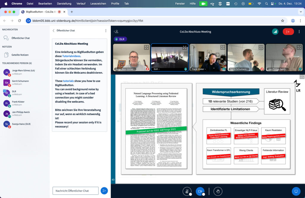 Nach insgesamt 3 Jahren Laufzeit fand am Donnerstag, den 04.12.2025, in Sankt Augustin ein letztes gemeinsames Treffen zum erfolgreichen Abschluss des CoLDa-Projekts statt. Teilnehmende waren Prof. Jorge Marx Gómez, Prof. Frank Köster, Dr. Michael Karl, Dr. Oscar Ramirez Agudelo, Lars Steffens, Gerrit Schumann, Jan-Philipp Awick und Leonie Etzold. Zu den wesentlichen Inhalten des Treffens zählten die Vorstellung der abgeschlossenen 14 Arbeitspakete und 18 Meilensteine, der erfolgten 11 Publikationen sowie der 6 betreuten studentischen Abschlussarbeiten, die Darstellung der wesentlichen Funktionalitäten des Demonstrators sowie die Sicherstellung der Projekt-Dokumentation.